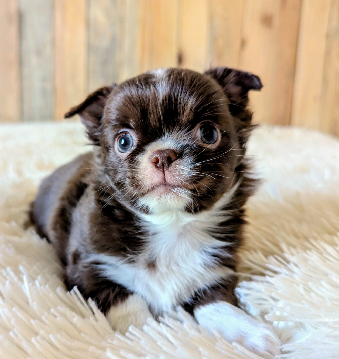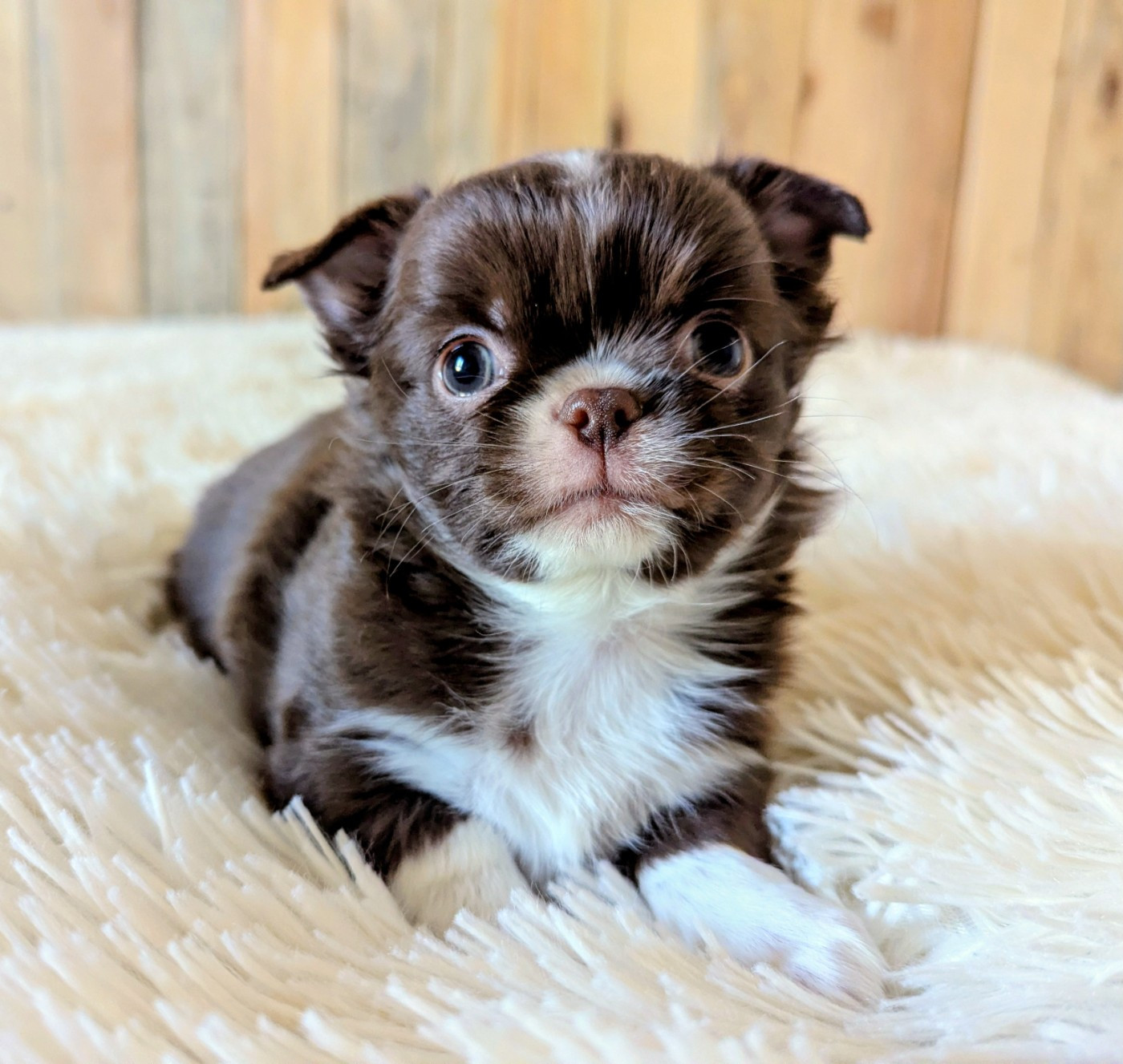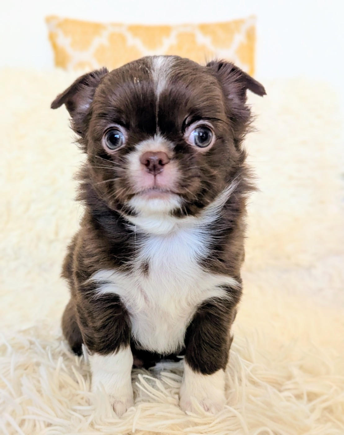 Adorable petite princesse chocolat et blanc. Poil court. Alys est une petite poupée très câline et n'en reste pas moins espiègle. Cette petite puce est réservée pour Karine qu'il attend avec impatience.
